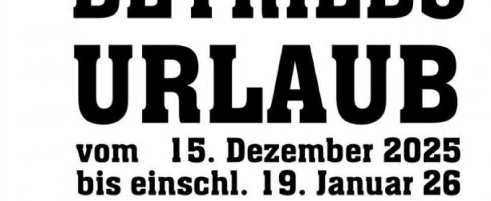 Unser diesjähriger Betriebsurlaub findet statt vom Montag, den 15. Dezember 2025 bis einschließlich Montag, den 19. Januar 2026